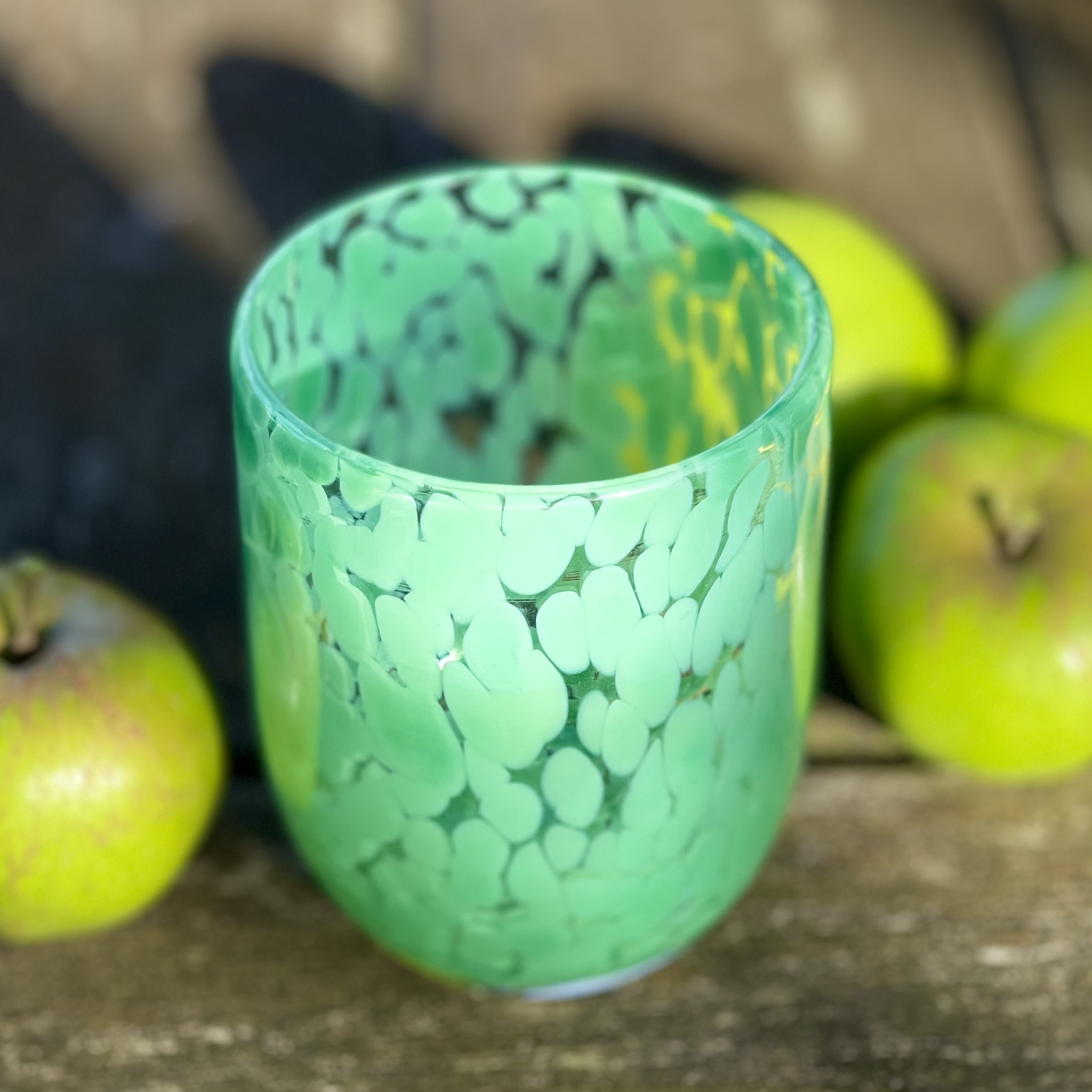 Rejält och stabilt glas ?Messi? från Byon i en alldeles magnifik salviagrön färg. Tål diskmaskin. Höjd 10 cm.