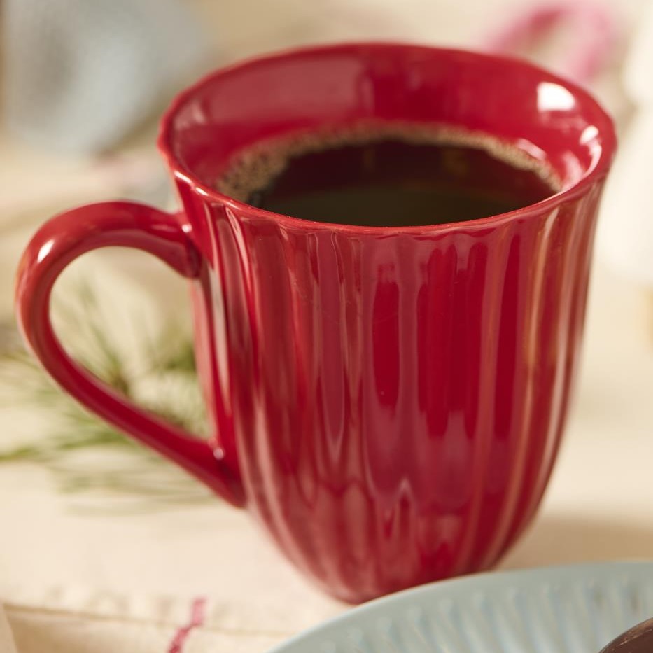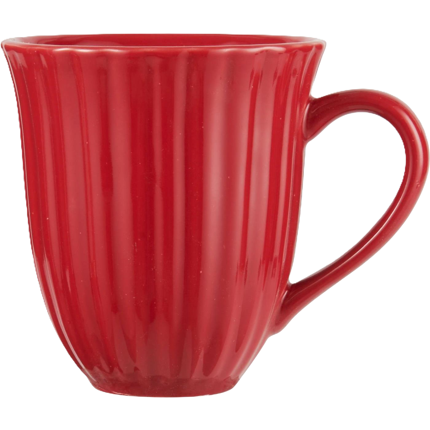 Mumsig röd mugg av stengods med vacker form. Julmugg eller sommarmugg, du bestämmer. Matcha gärna med assietten i samma serie. Tål diskmaskin, ugn, frys och micro. Höjd 10 cm, diameter 9,5 cm.