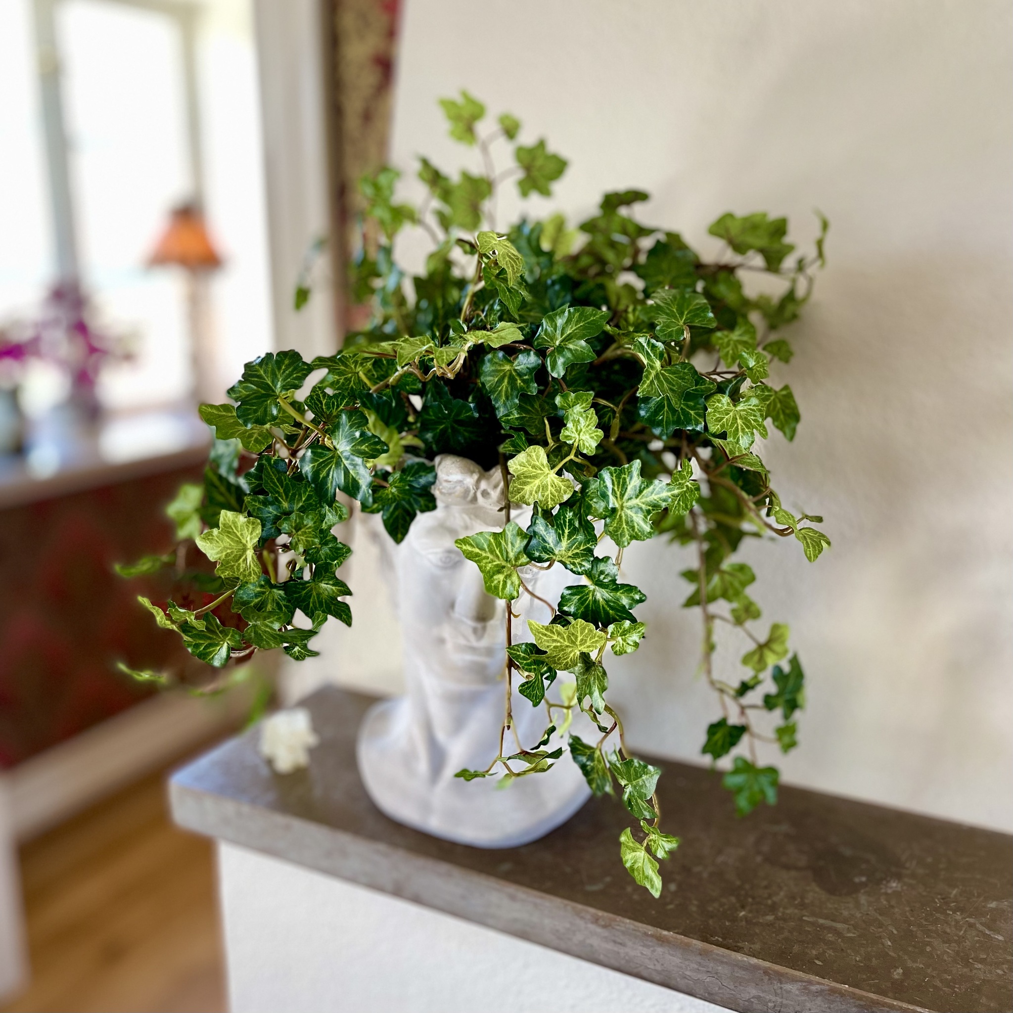 Konstgjord murgröna av absolut högsta kvalitet. Bör ej placeras i direkt solljus då produkten saknar UV-skydd och kan blekas. Längd 45 cm, krukans höjd 9 cm, krukans ø övre delen 10 cm, krukans ø bott
