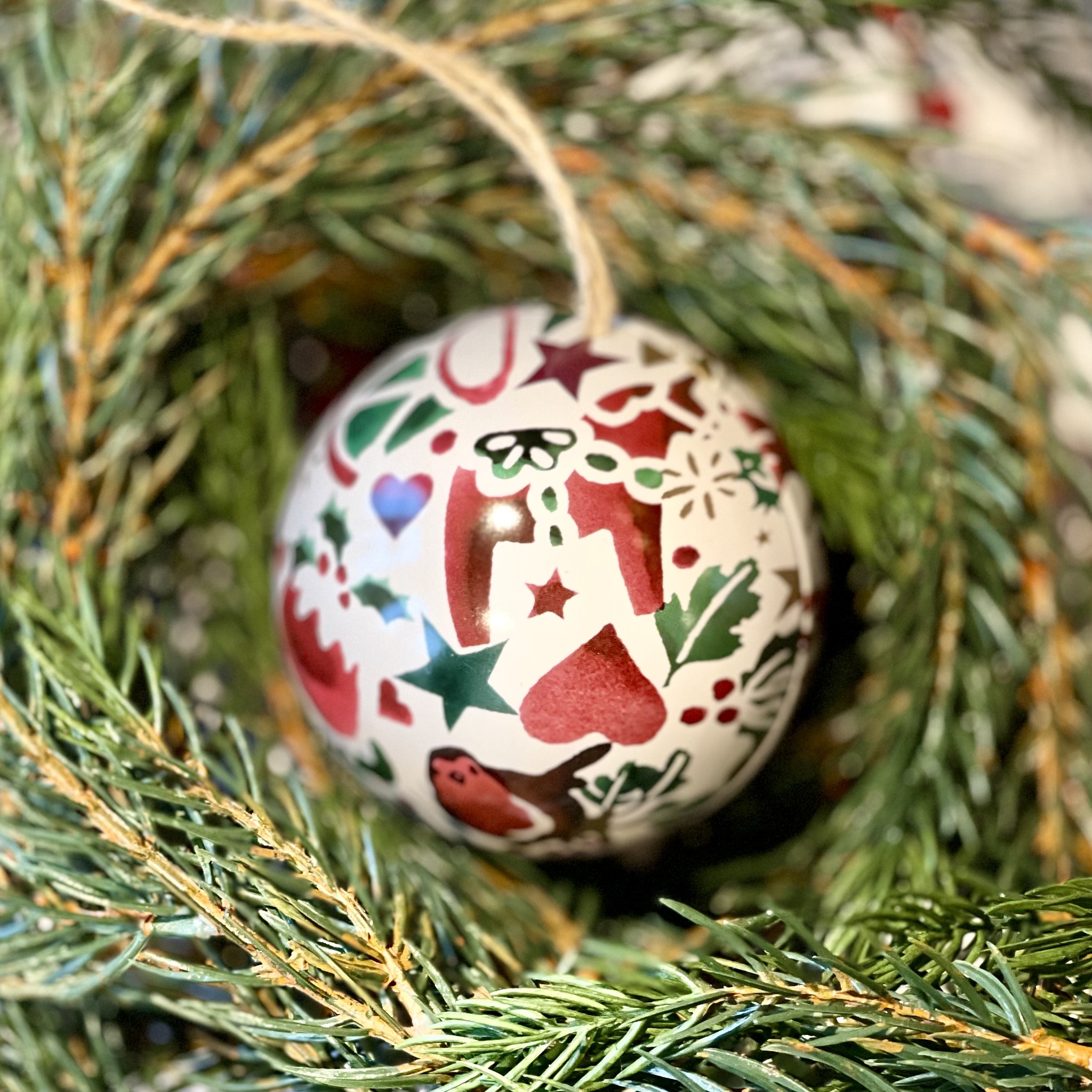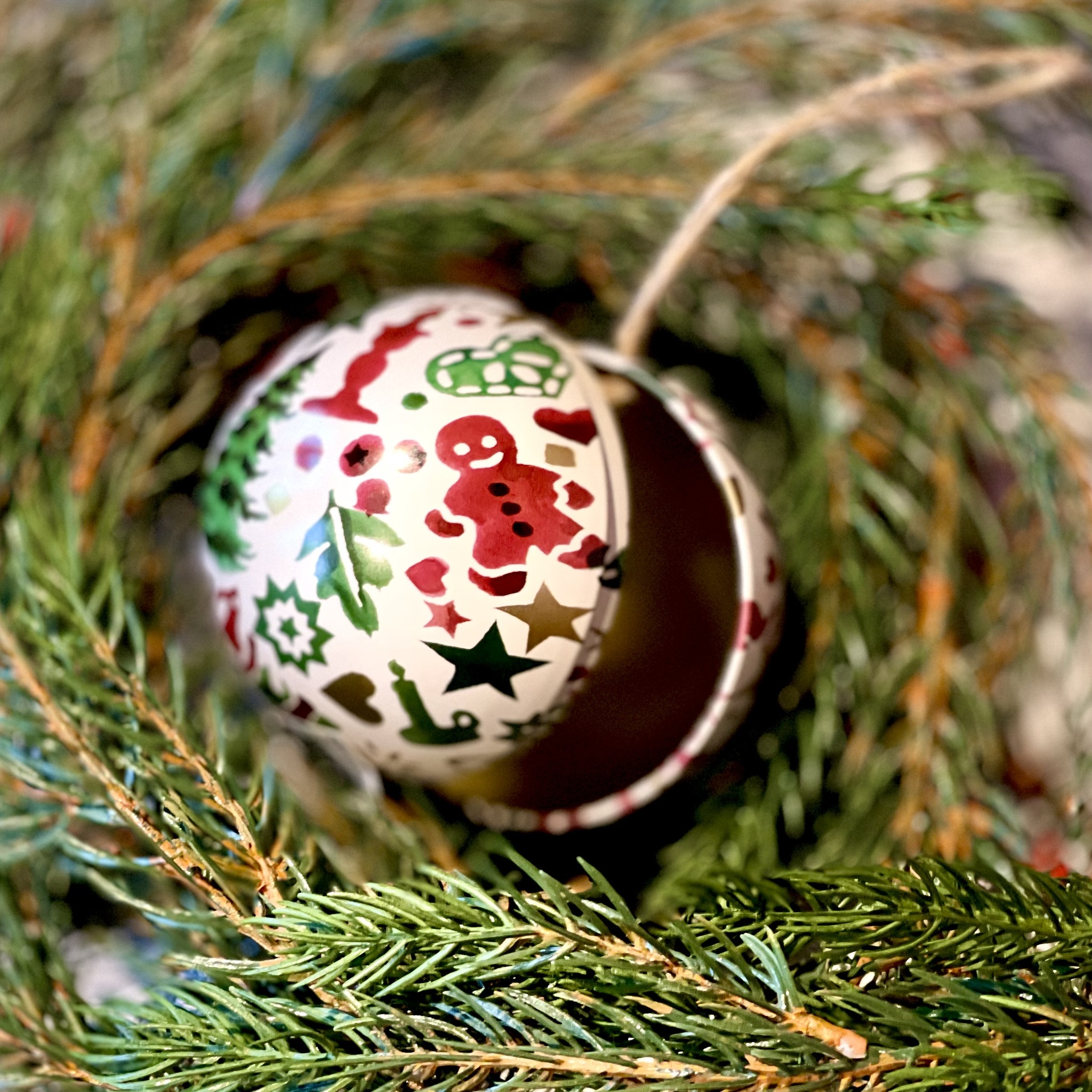 Öppningsbar julgranskula av metall från Emma Bridgewater, perfekt att gömma godis i inför julgransplundringen eller varför inte en hemlig julklapp? Diameter 7 cm.