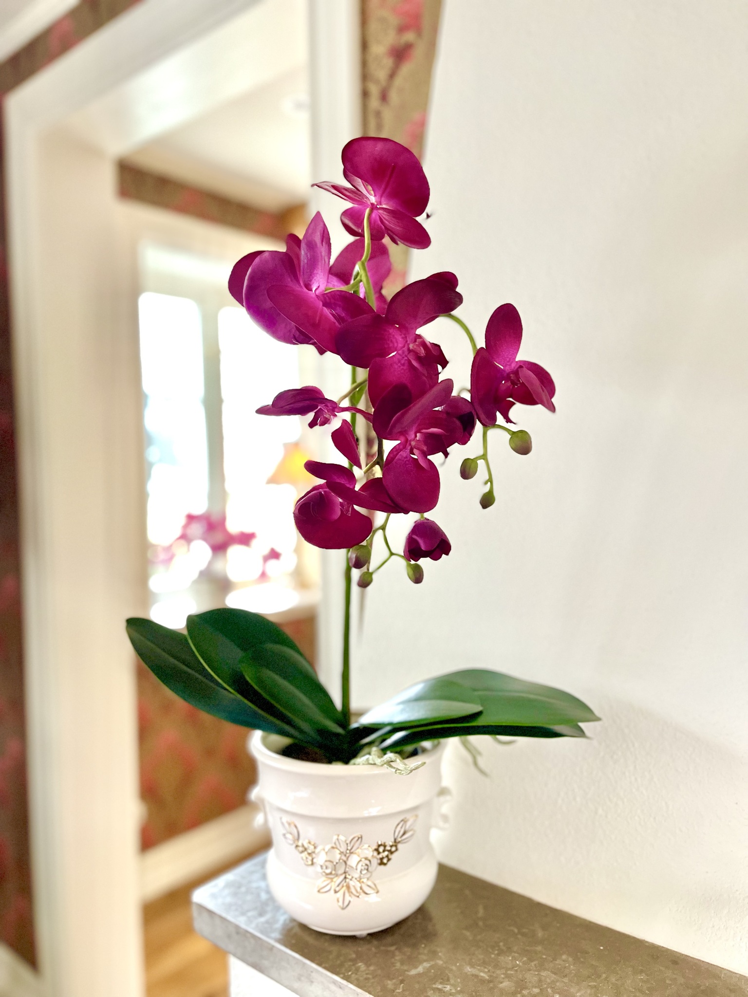 Konstgjord lila phalaenopsis av absolut högsta kvalitet. Bör ej placeras i direkt solljus då produkten saknar UV-skydd och kan blekas. Höjd 60 cm, krukans höjd 10 cm, kruka ø övre kanten 12 cm, krukans ø botten 8 cm.