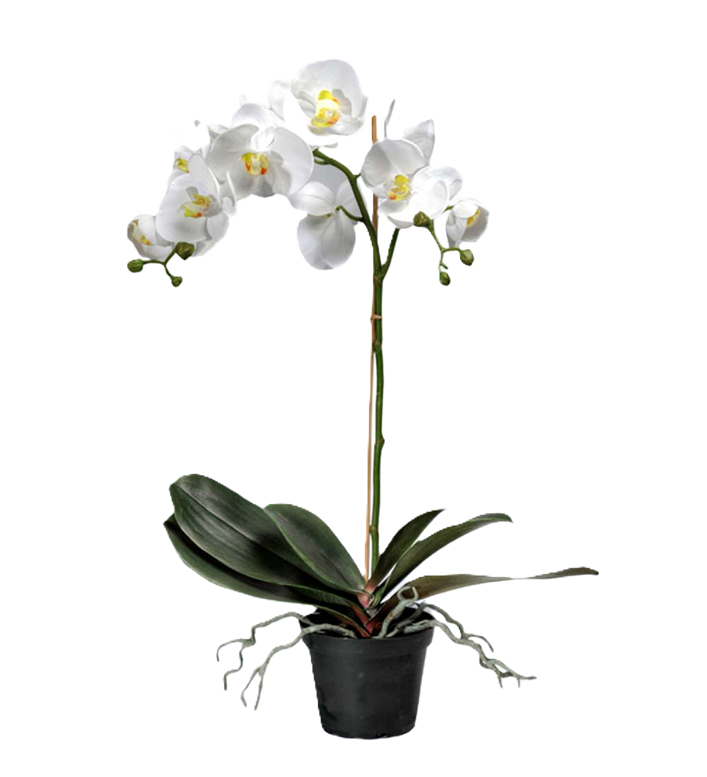 Konstgjord vit phalaenopsis av absolut högsta kvalitet. Bör ej placeras i direkt solljus då produkten saknar UV-skydd och kan blekas. Höjd 60 cm, krukans höjd 10 cm, kruka ø övre kanten 12 cm, krukans ø botten 8 cm.