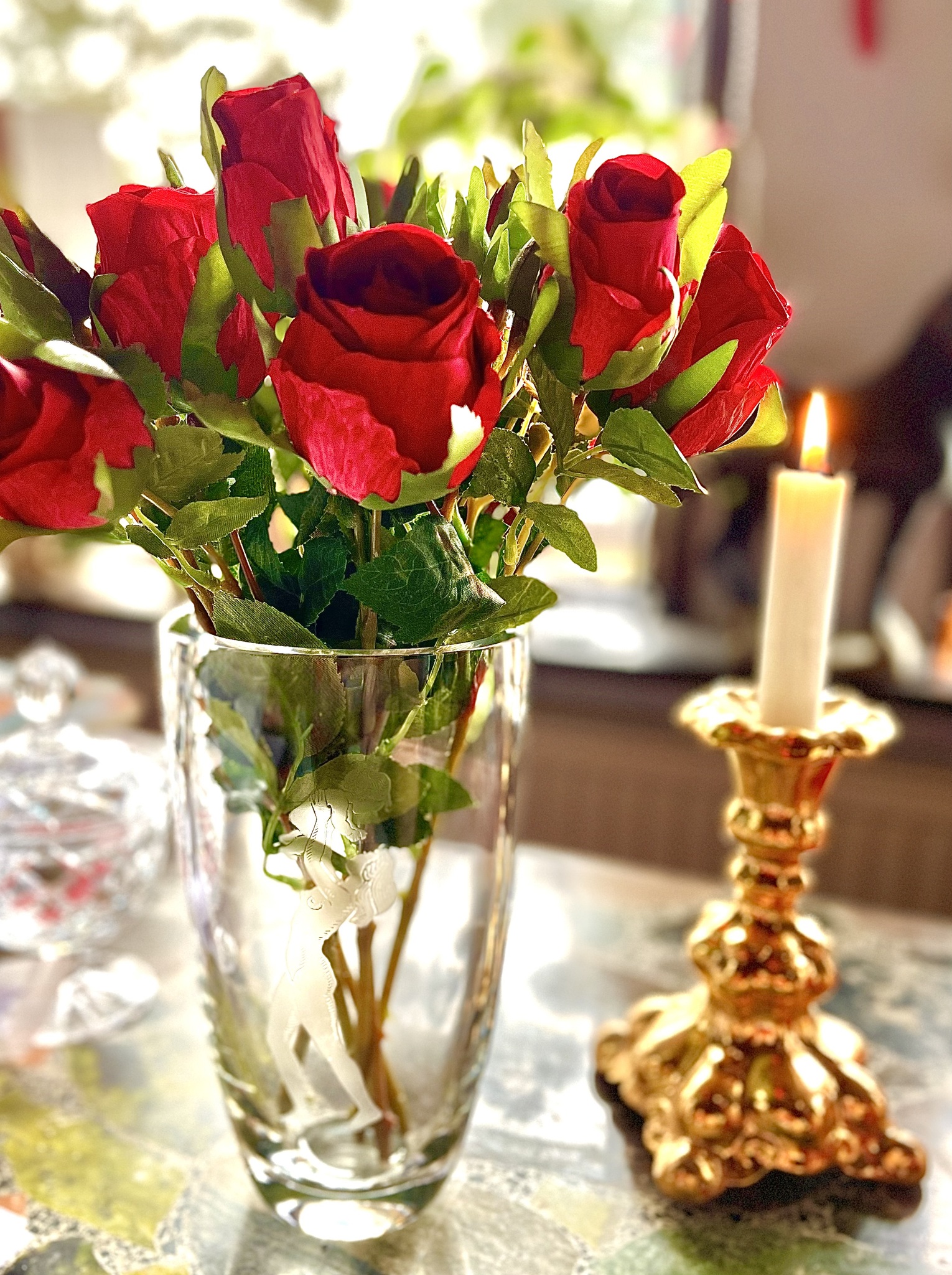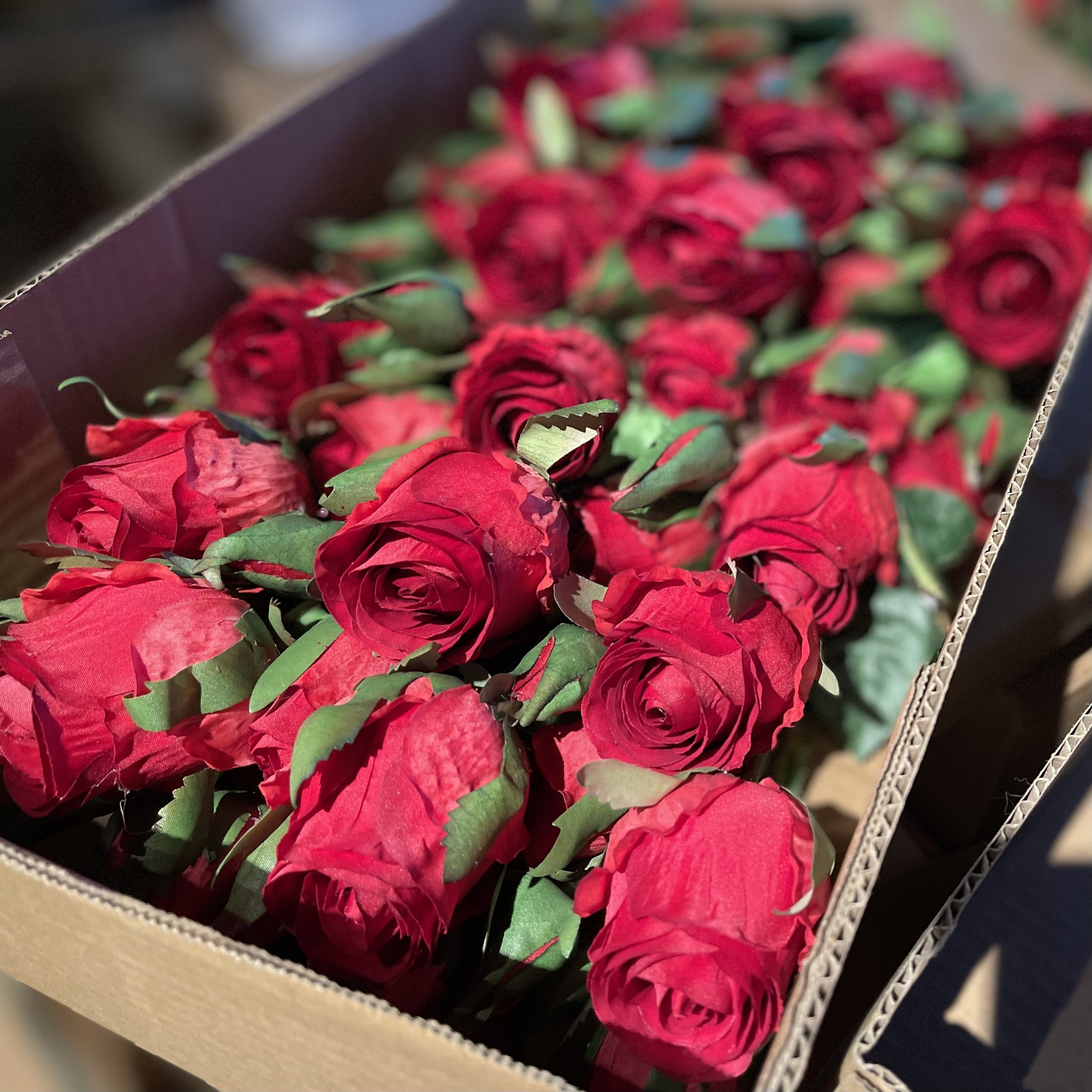 Konstgjord röd ros av absolut högsta kvalitet. Se sista bilden för hur blomman ser ut styckvis. Buketten på bild 2 innehåller sex stycken rosor. Kortas enkelt med en avbitartång. Bör ej placeras i dir