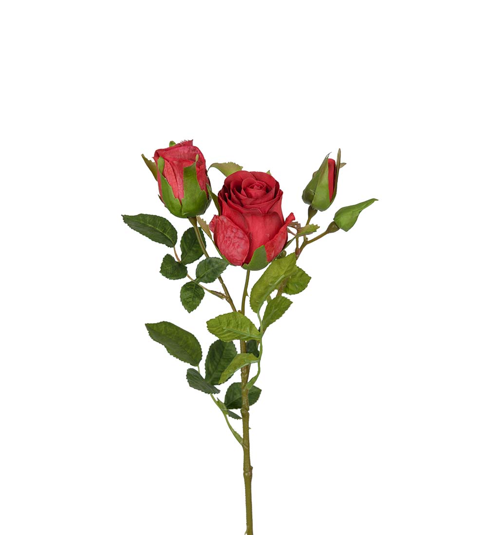 Konstgjord röd ros av absolut högsta kvalitet. Se sista bilden för hur blomman ser ut styckvis. Buketten på bild 2 innehåller sex stycken rosor. Kortas enkelt med en avbitartång. Bör ej placeras i direkt solljus då produkten saknar UV-skydd och kan blekas. Höjd 40 cm.