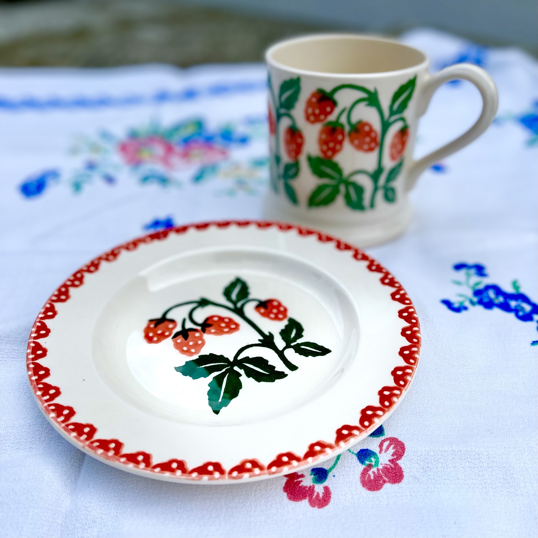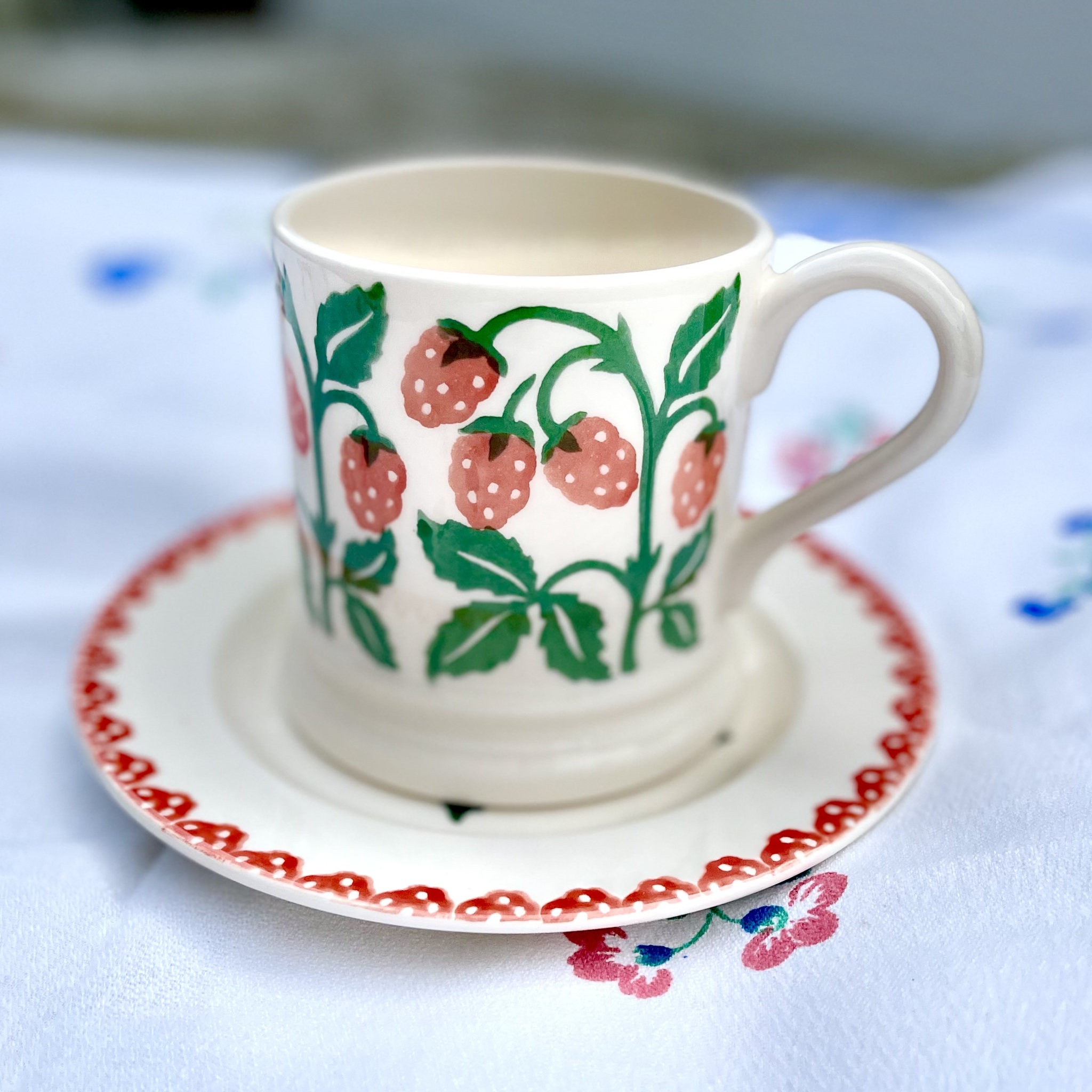 Ett alldeles bedårande set med porslinsmugg och porslinsassiett av absolut högsta kvalitet i design av Emma Bridgewater. Din frukost och fikastund är räddad. Mönster ?Raspberries? (hallon). Tål maskindisk och micro. Mugg höjd 9,5 cm, assiett diameter 16,5 cm.