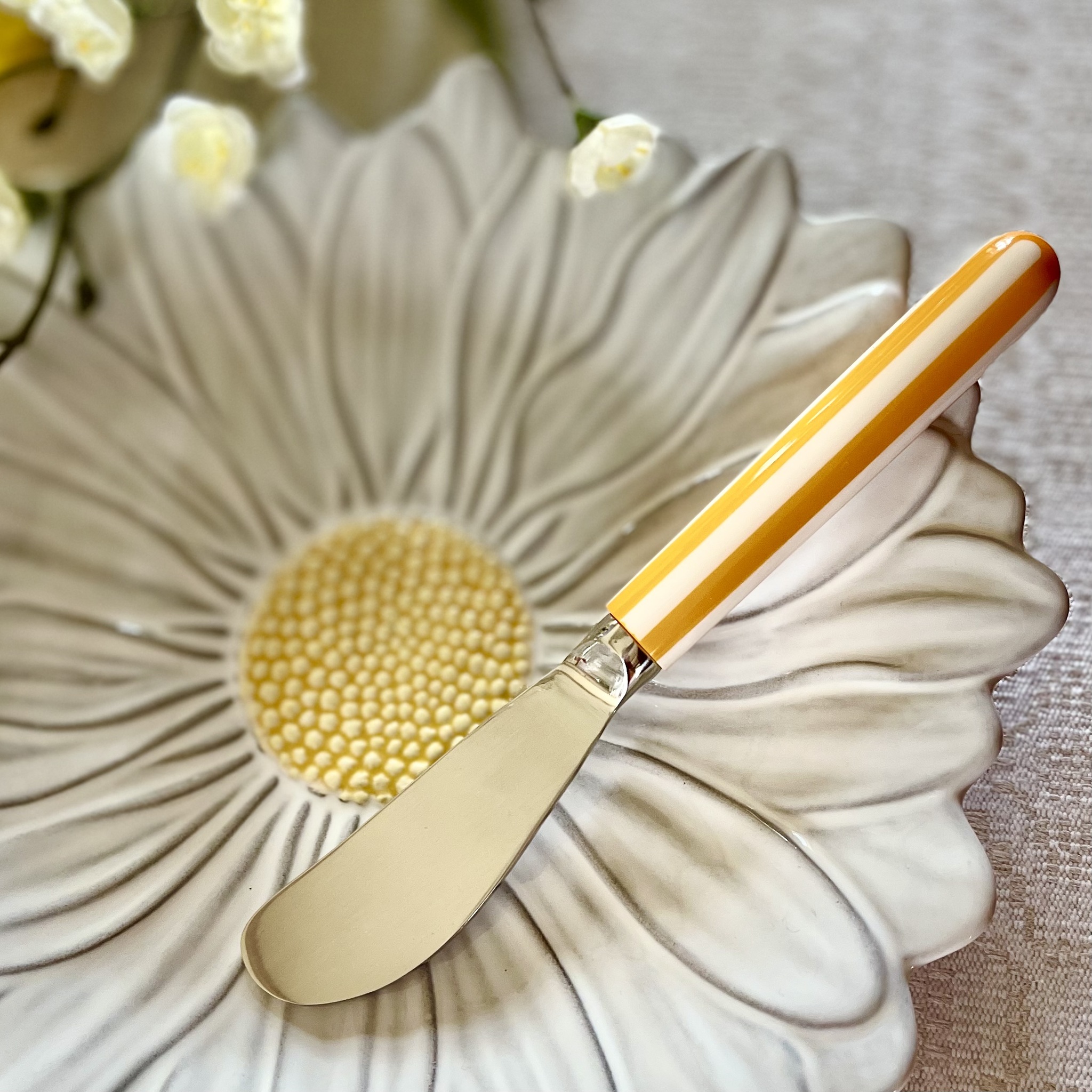 Matcha ditt gula porslin eller toppa din påskdukning med en vit- och gulrandig smörkniv, bättre kan det knappast bli. Längd 17,5 cm.