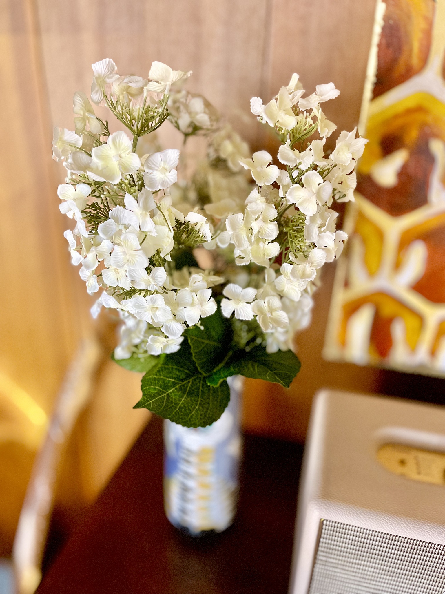 Konstgjord vit syrénhortensia av absolut högsta kvalitet. Buketten på andra och tredje bilden innehåller tre stycken kvistar. Bör ej placeras i direkt solljus då produkten saknar UV-skydd och kan blek